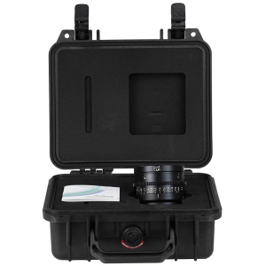 Objektivet levereras i en hård, skyddande Pelican-väska med formskuren inredning av skumgummi som dämpar stötar vid transport.